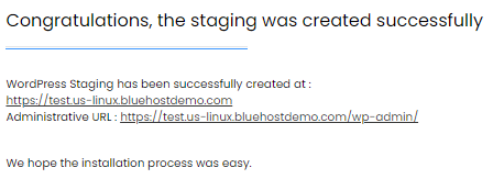F)单击“Create staging”。根据实时网站的大小,可能需要几分钟的时间。准备好后,您将看到如下图所示的消息。您也可以在临时网站上使用与实时网站相同的凭据。