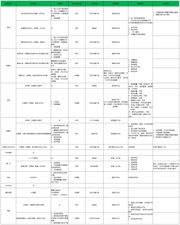 除了以上四家,我们还搜集了简道云、轻流、织信、天翎MyApps平台、魔方网表的商务合作信息。除了前面提到的几点,在价格政策上各厂商普遍采取的都是返佣金、利润分成、折扣价拿产品的方式。对于客户续约对象的限制各家也不同,轻流和简道云无论哪种模式的合作方带来的客户最终都需要和官方续约,而其他平台的代理商合作直接与代理商续约即可。无论你选择做中间商还是代理商都不同程度需要承受官方的制约。