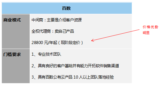 百数的全权代理商的合作模式目前在市面上是唯一的,支持合作伙伴自定义品牌名称,并且售价也是自主的不受官方限制。门槛要求公开透明,需要有技术团队、渠道以及此前用过百数公有云。