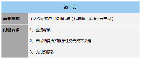 道一云的商业模式有两种,一是类似中间商的个人客户资源介绍,另外一种就是渠道代理。门槛要求没有具体指标呈现,但对于产品报价官方有所限制,不得低于产品市场价,针对已报备客户不得以低于甲方产品市场价的7.5折进行报价。