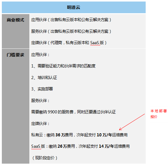 明道云产品采取的是本地部署的方式,因此可以看到门槛要求当中很突出的价格展示,对资金投入的要求会比较高。并且对于合作伙伴的专业匹配度要求比较高,需要通过培训考试拿到资格认证。